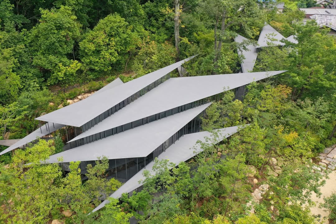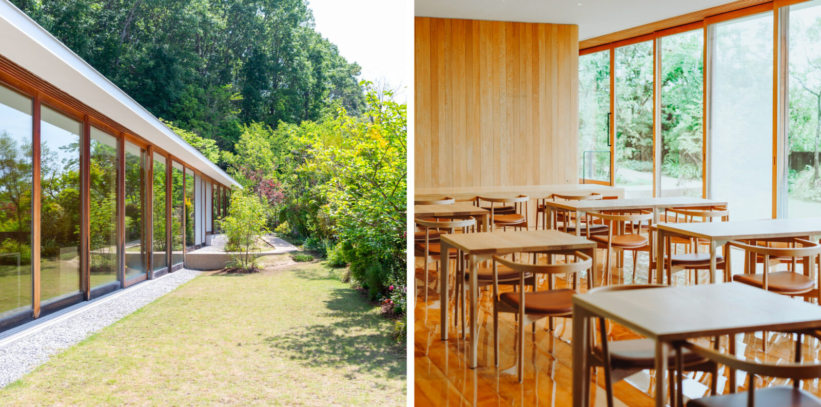 周辺の木々との並びを意識し、幹の太さに寄せた358本の柱。限りなく透明な全面ガラスの壁や、半田山の稜線に沿うよう不等辺三角形を連結させた独特のフォルム。建物の外観をどこまでも希薄にすることで“森に溶け込む建築”とし、一体が自然空間となっています。