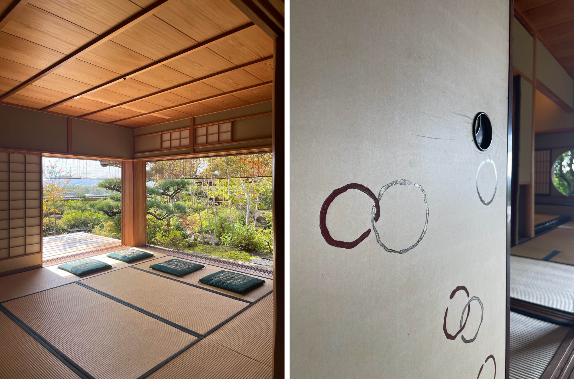 (左:2024年11月 Fサロンから眺める庭/右:漆とシルバーで描かれた輪違紋、引手は本桑)