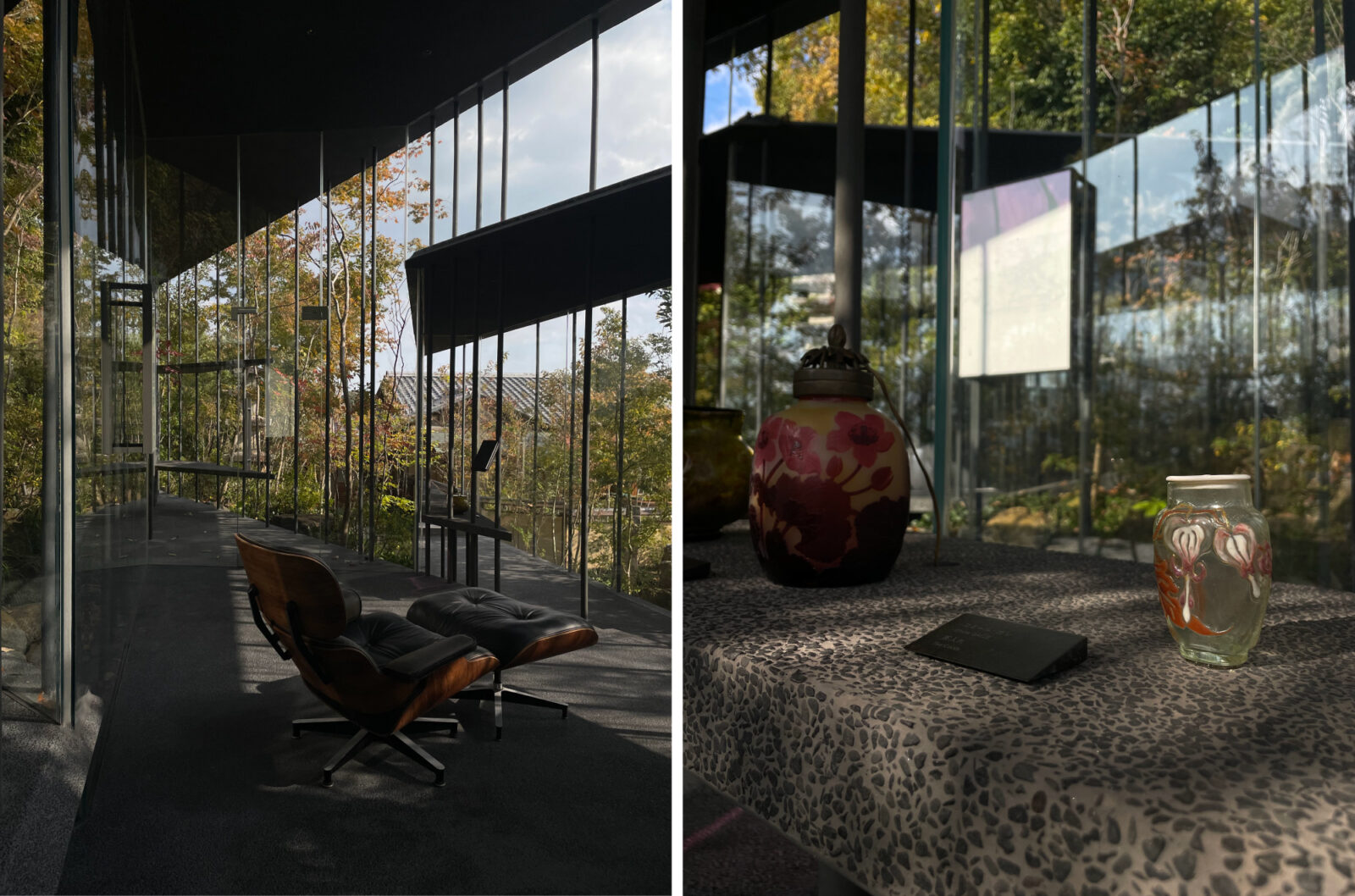 (Fギャラリー内 左:哲彦氏が愛用していた初代イームズチェア/エミール・ガレの茶入れ)