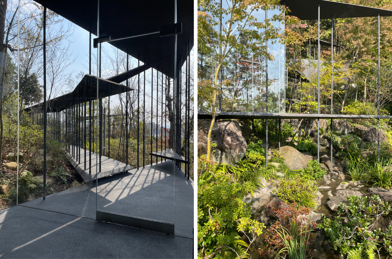 (左:2025年3月 春を待つ木々に囲まれたFギャラリー/右:2024年11月 Fギャラリー外観、足元には繊細な瀧が流れる)