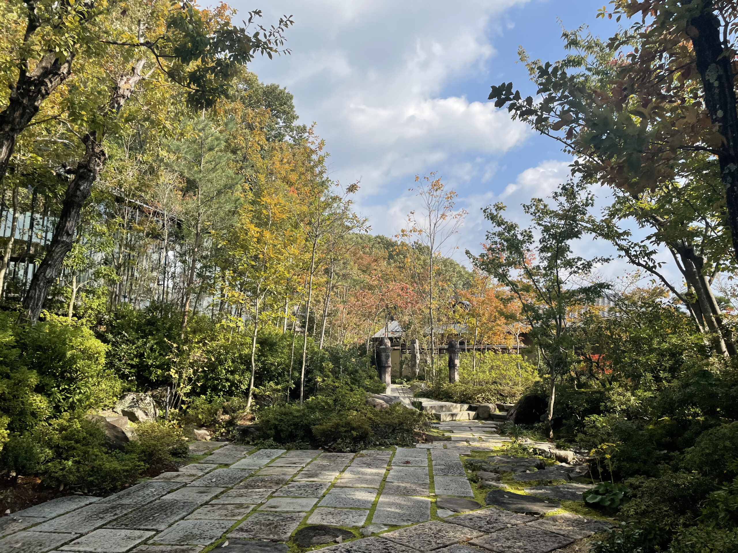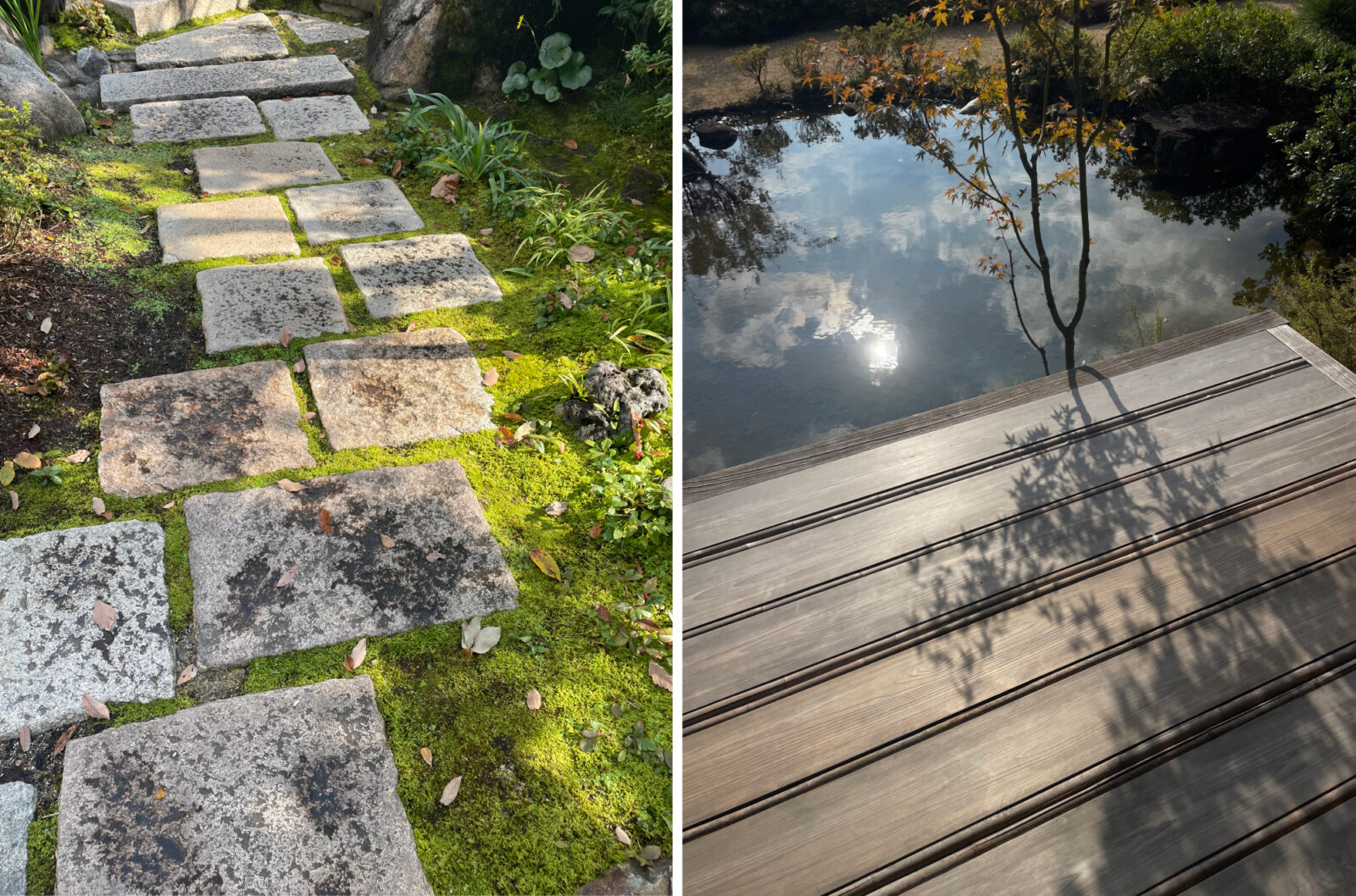 (2024年11月 左:初冬の装いの石畳/右:Fサロンの月見台から池を眺める)
