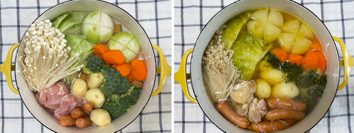 ポトフも同様、具材やスープの味付けはいつもご家庭でされているやる方で大丈夫です。今回は野菜を大きめにカットしたり丸ごと入れてみました。特に、ジャガイモは崩れやすいので丸ごと入れたほうが良いかもしれません。